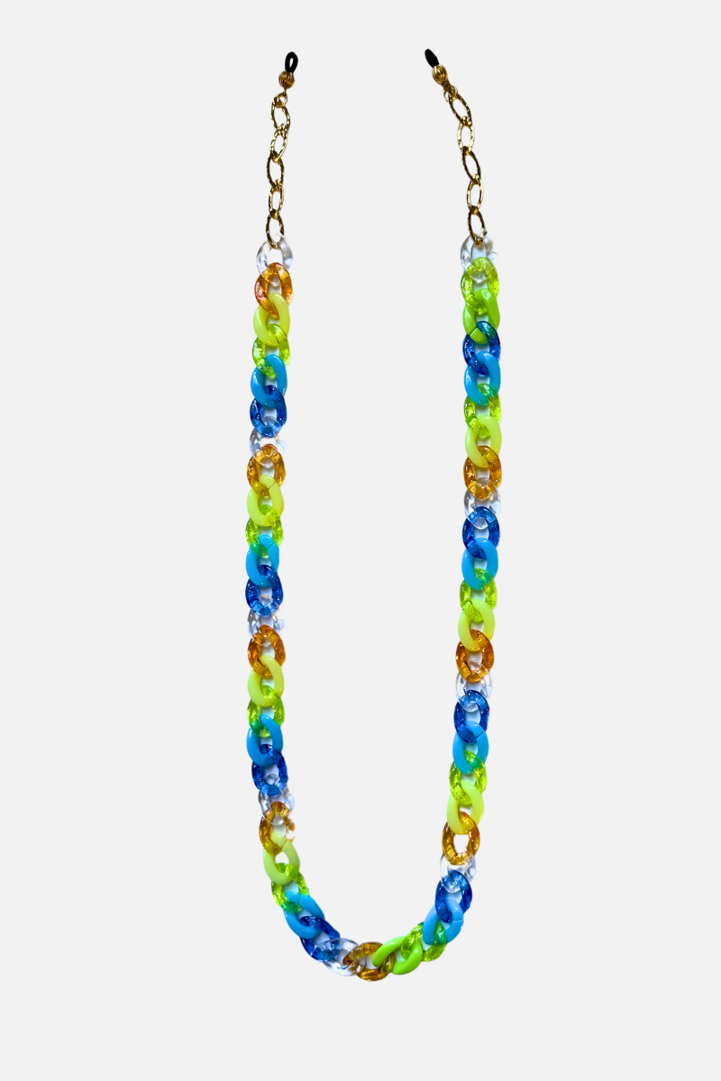 - A mix of glossy and glitter orange, yellow, green, light blue, turquoise and royal blue acrylic curb links