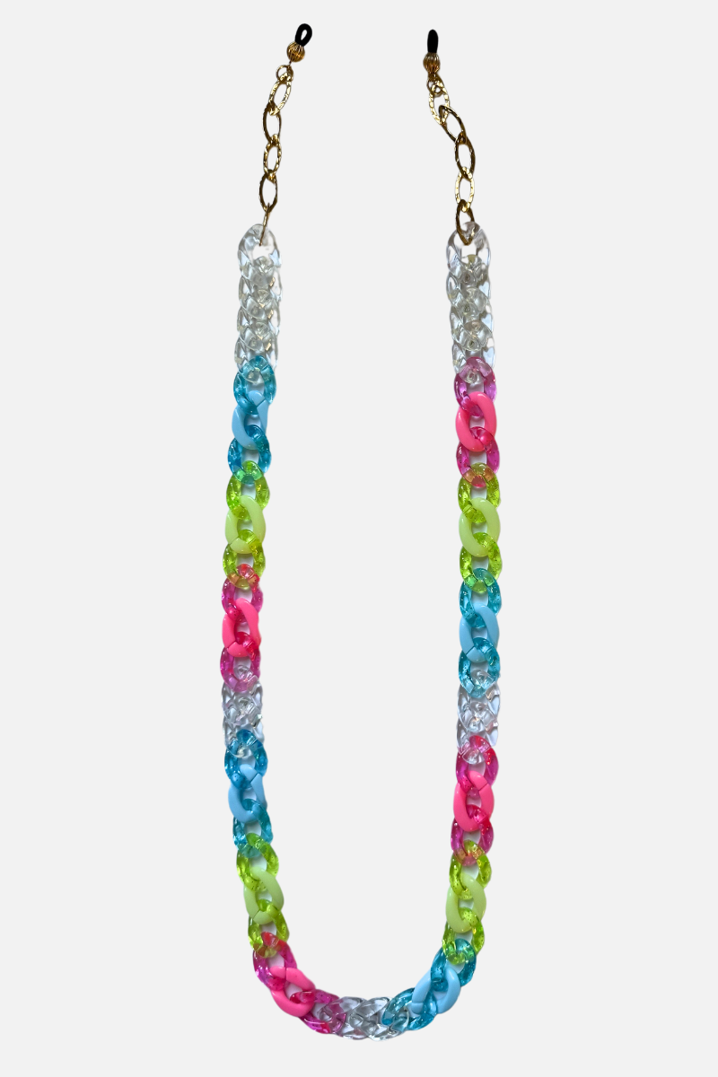 - A mix of bright pink, lime green and sky blue glossy and glitter acrylic curb links